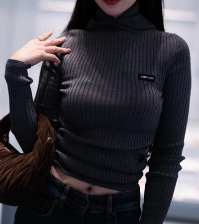 • [홍콩명품,MIU MIU] 미우미우 25SS 로고 여성 니트 후드 티셔츠 (그레이), BM19578, 13C, 홍콩명품의류,구매대행,온라인명품
