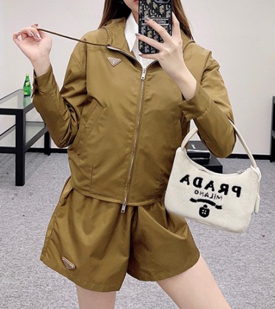 [홍콩명품,PRADA] 프라다 25SS 삼각로고 여성 후드 바람막이 자켓 + 미니 쇼츠 반바지 상하의 세트 (카라멜), BM19728, TBG, 홍콩명품의류,구매대행,온라인명품 > 여성몰