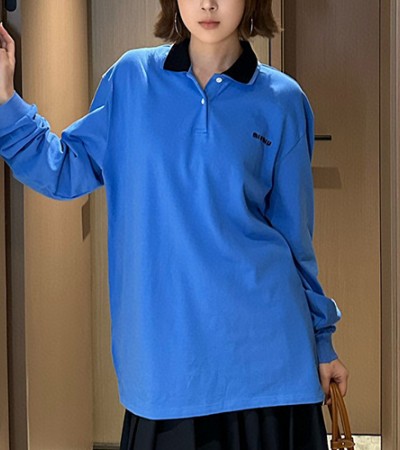 • [홍콩명품,MIU MIU] 미우미우 25SS 로고 자수 여성 카라 폴로 긴팔 티셔츠 (블루), BM19911, TBG, 홍콩명품의류,구매대행,온라인명품