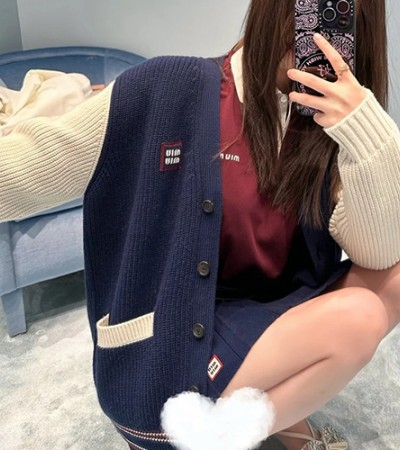 • [홍콩명품,MIU MIU] 미우미우 25SS 로고 여성 V넥 니트 가디건 (네이비), BM21920, KB, 레플리카의류,미러급사이트