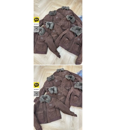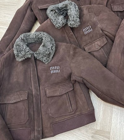 • [홍콩명품,MIU MIU] 미우미우 25SS 로고 레더 가죽 시어링 봄버 자켓 (브라운), BM22808, TOM, 레플리카의류,미러급사이트