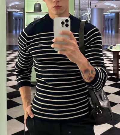 [홍콩명품,PRADA] 프라다 25SS 로고 스트라이프 니트 스웨터 티셔츠 (네이비), BM22976, KB, 레플리카의류,미러급사이트 > 남자의류
