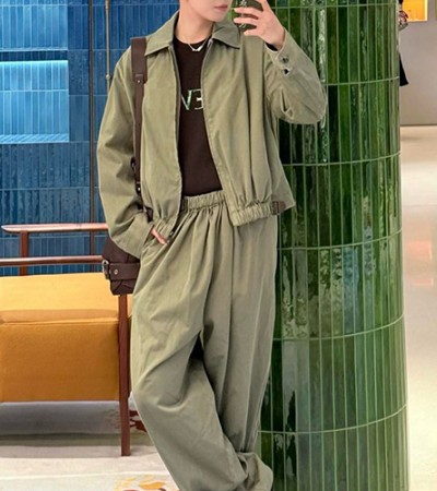 [홍콩명품.LOEWE] 로에베 25SS 로고 자수 카라 봄버 자켓 + 오버핏 팬츠 바지 상하의 세트 (카키), BM23119, JL, 레플리카의류,미러급사이트 > 남자의류
