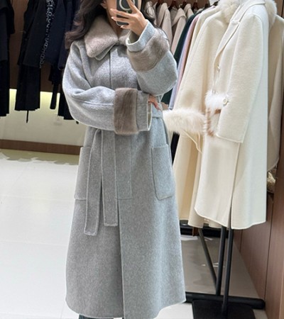 • [홍콩명품,FENDI] 펜디 25SS 로고 여성 밍크퍼 카라 캐시미어 롱 코트 자켓 (그레이), BM23595, TOM, 레플리카의류,미러급사이트