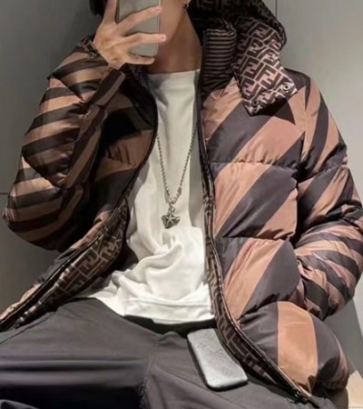 [홍콩명품,FENDI] 펜디 25SS 로고 패턴 리버서블 다운 패딩 후드 바람막이 자켓 (브라운), BM23701, KK, 레플리카의류,미러급사이트 > 남자의류