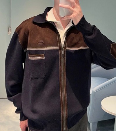 [홍콩명품,MIU MIU] 미우미우 25SS 로고 카라 집업 자켓 (네이비-브라운), BM24239, KK, 레플리카의류,미러급사이트 > 남자의류