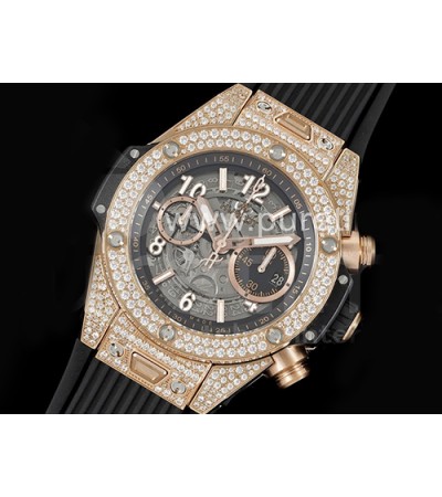 • 휴블럿 빅뱅 유니코 로즈골드 풀 다이아몬드 스켈레톤 다이얼 | Hublot Big Bang Unico RG Full Diamonds ZF 1:1 Best Edition Skeleton Dial on Black Rubber Strap A1280