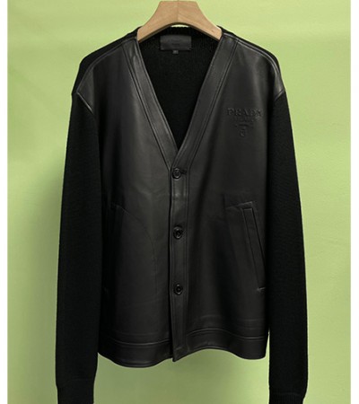 [홍콩명품,PRADA] 프라다 23SS 로고 코튼 V넥 가죽 레이어드 가디건 (블랙), BM10434, JL, 홍콩명품가방,명품쇼핑몰,크로스백,핸드백,구매대행,무브타임 > 남자의류