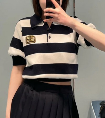 • [홍콩명품,MIU MIU] 미우미우 24SS 로고 여성 스트라이프 쇼트 카라 반팔 티셔츠, BM12457, TBG, 홍콩명품의류,구매대행,온라인명품