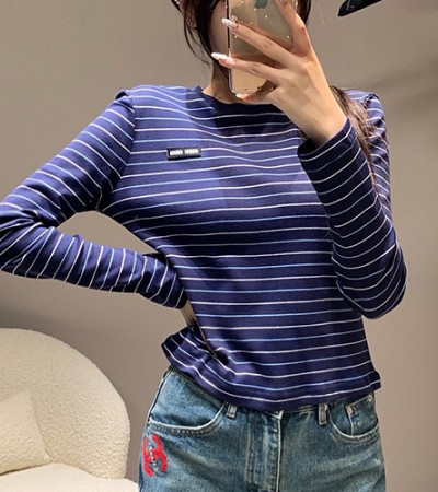 • [홍콩명품,MIU MIU] 미우미우 24SS 로고 여성 스트라이프 쇼트 긴팔 티셔츠 (블루), BM12896, TBG, 홍콩명품의류,구매대행,온라인명품
