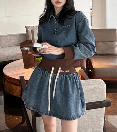 • [홍콩명품,MIU MIU] 미우미우 24SS 로고 여성 데님 셔츠 + 미니 스커트 상하의 세트, BM13366, SG, 홍콩명품의류,구매대행,온라인명품