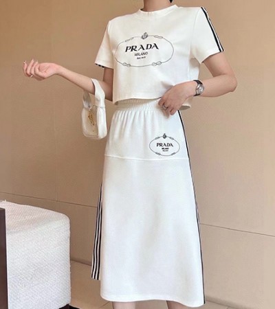 • [홍콩명품,PRADA] 프라다 24SS 로고 자수 여성 쇼트 반팔 티셔츠 + 미디 스커트 상하의 세트 (2컬러), BM14015, S1F, 홍콩명품의류,구 매대행,온라인명품