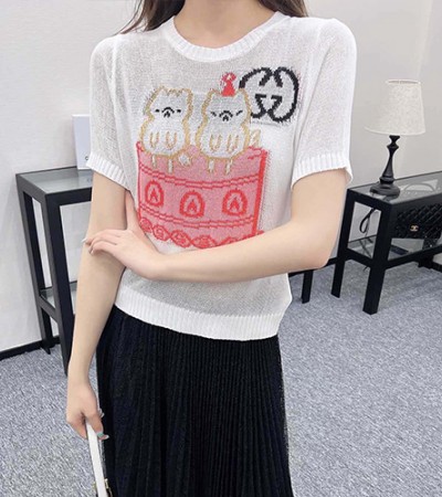 • [홍콩명품.Gucci] 구찌 24SS 로고 그래픽 여성 니트 반팔 티셔츠 (화이트), BM14237, TBG, 홍콩명품의류,구매대행,온라인명품