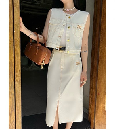 • [홍콩명품,MIU MIU] 미우미우 24SS 로고 자수 여성 데님 베스트 조끼 + 미디 스커트 상하의 세트 (2컬러), BM14561, S1F, 홍콩명품의류,구매대행,온라인명품