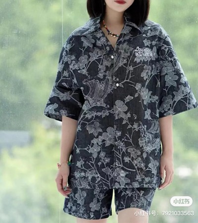 [홍콩명품.LOUIS VUITTON] 루이비통 24SS 로고 자수 플라워 패턴 데님 반팔 남방 셔츠 + 쇼츠 반바지 상하의 세트 (블랙), BM14639, JU, 홍콩명품의류,구매대행,온라인명품 요약정보 및 구매