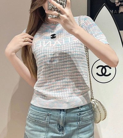 • [홍콩명품.CHANEL] 샤넬 24SS 로고 여성 니트 반팔 티셔츠 (2컬러), BM14805, TBG, 홍콩명품의류,구매대행,온라인명품