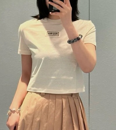 [홍콩명품,MIU MIU] 미우미우 24SS 로고 자수 여성 반팔 티셔츠 (베이지), BM14886, TBG, 홍콩명품의류,구매대행,온라인명품 > 여성몰
