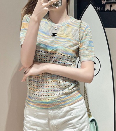 • [홍콩명품.CHANEL] 샤넬 24SS 로고 패턴 여성 니트 반팔 티셔츠, BM14893, TBG, 홍콩명품의류,구매대행,온라인명품