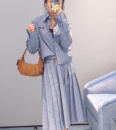• [홍콩명품,MIU MIU] 미우미우 24SS 로고 자수 여성 체크 패턴 남방 셔츠 + 미디 스커트 상하의 세트, BM14934, SG, 홍콩명품의류,구매대행,온라인명품