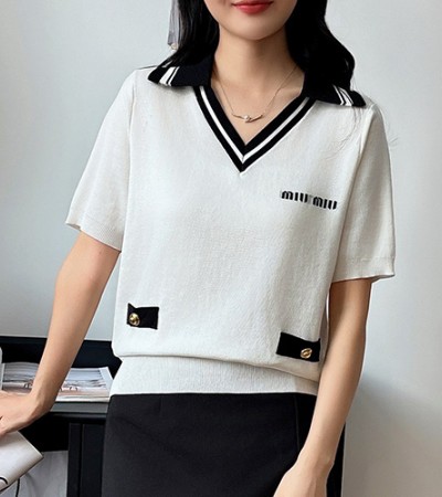 • [홍콩명품,MIU MIU] 미우미우 24SS 로고 여성 카라 V넥 니트 반팔 티셔츠 (2컬러), BM15288, TBG, 홍콩명품의류,구매대행,온라인명품