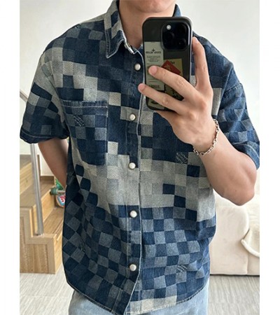 [홍콩명품.LOUIS VUITTON] 루이비통 24SS 로고 다미에 데님 반팔 남방 셔츠, BM15500, JL, 홍콩명품의류,구매대행,온라인명품 > 남자의류