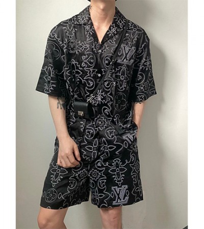 [홍콩명품.LOUIS VUITTON] 루이비통 24SS 로고 모노그램 파자마 반팔 남방 셔츠 + 쇼츠 반바지 상하의 세트 (블랙), BM15554, JU, 홍콩명품의류,구매대행,온라인명품 > 남자의류