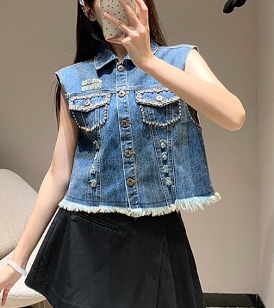 • [홍콩명품,MIU MIU] 미우미우 24SS 로고 자수 여성 데님 조끼 베스트, BM15718, TBG, 홍콩명품의류,구매대행,온라인명품