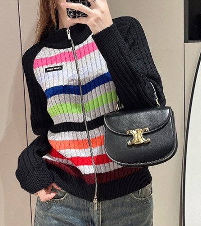 • [홍콩명품,MIU MIU] 미우미우 24SS 로고 여성 터틀넥 스트라이프 니트 가디건 자켓, BM16462, TBG, 홍콩명품의류,구매대행,온라인명품
