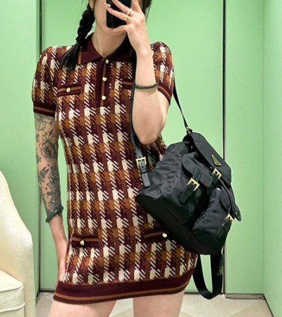 [홍콩명품,PRADA] 프라다 24SS 로고 패턴 여성 니트 반팔 원피스 (브라운), BM16821, 홍콩명품의류,구매대행,온라인명품 요약정보 및 구매