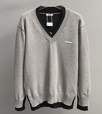 • [홍콩명품,MIU MIU] 미우미우 24SS 로고 V넥 니트 스웨터 (그레이), BM16942, JU, 홍콩명품의류,구매대행,온라인명품