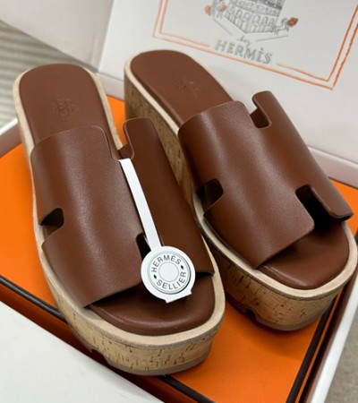 • [홍콩명품.Hermes] 에르메스 24SS 로고 여성 레더 가죽 굽 슬리퍼 (브라운), SE4224, H3, 명품스니커즈,운동화,구두,로퍼,하이탑,신발
