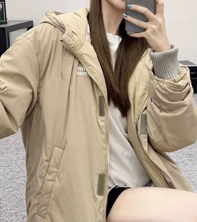 • [홍콩명품,MIU MIU] 미우미우 24SS 로고 여성 후드 다운 파카 자켓 (베이지), BM17475, KB, 홍콩명품의류,구매대행,온라인명품