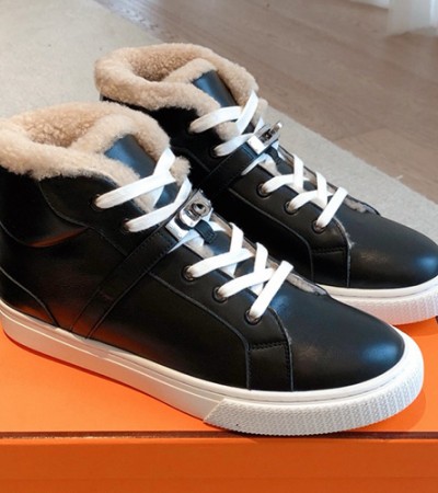 • [홍콩명품.Hermes] 에르메스 24SS 로고 남여 레더 가죽 양털 하이탑 운동화 (블랙), SE4326, S3, 명품스니커즈,운동화,구두,로퍼,하이탑,신발