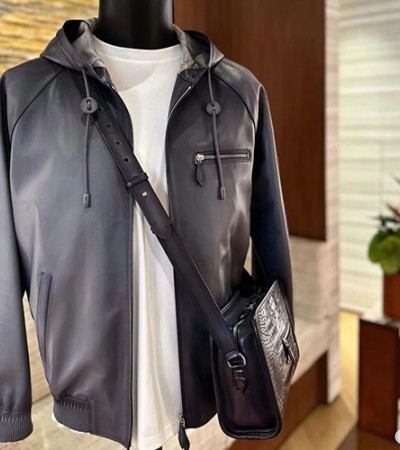 • [홍콩명품.BERLUTI] 벨루티 25SS 로고 레더 가죽 후드 봄버 자켓 (그레이), BM18153, TOM, 홍콩명품의류,구매대행,온라인명품