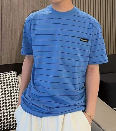 [홍콩명품,MIU MIU] 미우미우 25SS 로고 스트라이프 반팔 티셔츠 (블루), BM19570, KK, 홍콩명품의류,구매대행,온라인명품 > 남자의류