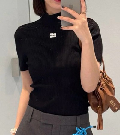 • [홍콩명품,MIU MIU] 미우미우 25SS 로고 여성 하이넥 니트 반팔 티셔츠 (블랙), BM19580, 13C, 홍콩명품의류,구매대행,온라인명품
