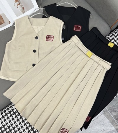 [홍콩명품,MIU MIU] 미우미우 25SS 로고 자수 여성 V넥 조끼 베스트 + 미디 스커트 상하의 세트 (2컬러), BM20598, GBG, 홍콩명품의류,구매대행,온라인명품 > 여성몰