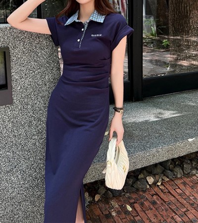 • [홍콩명품,MIU MIU] 미우미우 25SS 로고 자수 여성 카라 롱 원피스 (2컬러), BM21250, MR, 홍콩명품의류,구매대행,온라인명품