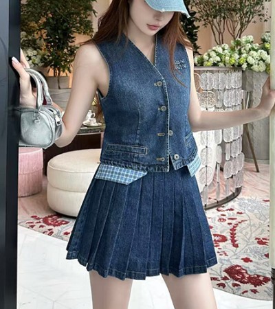 • [홍콩명품,MIU MIU] 미우미우 25SS 로고 여성 데님 조끼 베스트 + 미니 스커트 상하의 세트, BM21254, MR, 홍콩명품의류,구매대행,온라인명품