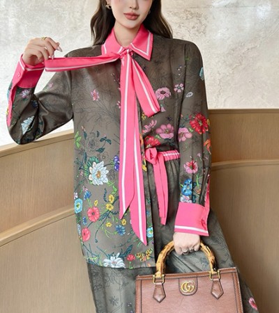 • [홍콩명품.Gucci] 구찌 25SS 로고 여성 플라워 패턴 블라우스 셔츠 (브라운), BM21960, MC, 레플리카의류,미러급사이트