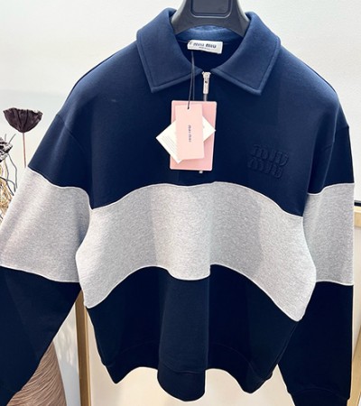 • [홍콩명품,MIU MIU] 미우미우 25SS 로고 하프지퍼 카라 맨투맨 티셔츠 (그레이-네이비), BM22673, YS, 레플리카의류,미러급사이트
