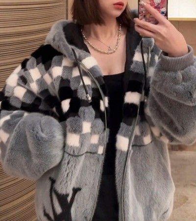 • [홍콩명품.LOUIS VUITTON] 루이비통 25SS 로고 다미에 퍼 후드 집업 자켓 1AGIYG (그레이), BM23016, KK, 레플리카의류,미러급사이트