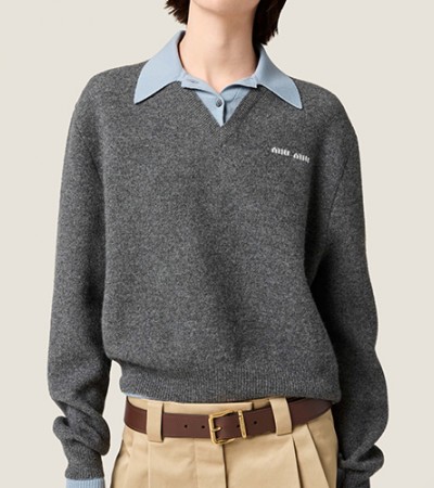 • [홍콩명품,MIU MIU] 미우미우 25SS 로고 2톤 카라 셔츠 니트 스웨터 (그레이), BM23405, JL, 레플리카의류,미러급사이트