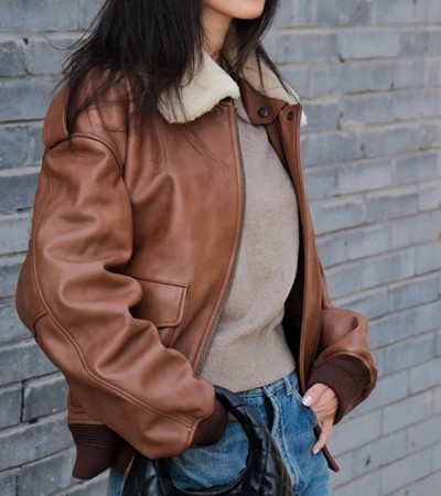 • [홍콩명품.YSL] 입생로랑 25SS 로고 여성 시어링 레더 가죽 봄버 자켓 (브라운), BM23845, PG, 레플리카의류,미러급사이트