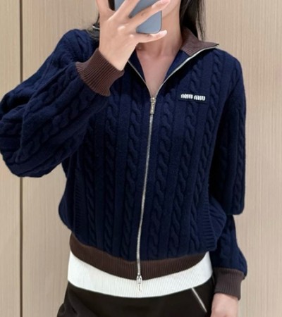 • [홍콩명품,MIU MIU] 미우미우 25SS 로고 여성 하이넥 캐시미어 니트 가디건 집업 자켓 (네이비), BM23880, JL, 레플리카의류,미러급사이트
