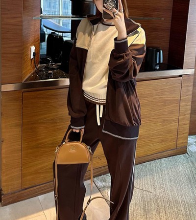 • [홍콩명품,MIU MIU] 미우미우 25SS 로고 트레이닝 카라 집업 자켓 + 조거 팬츠 바지 상하의 세트 (브라운), BM24235, KK, 레플리카의류,미러급사이트